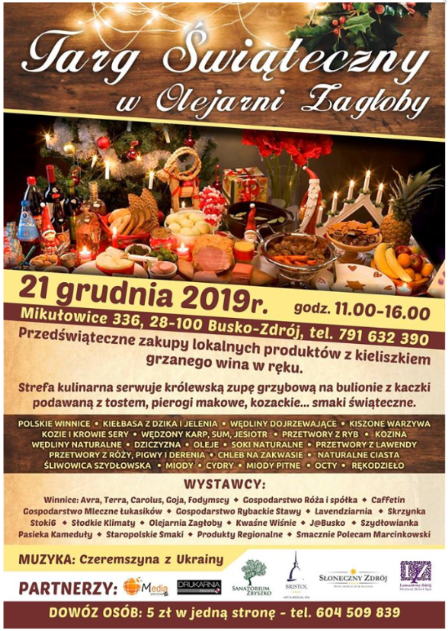 W sobotę, 21 grudnia 2019r. zapraszamy do Mikułowic, na wyjątkowy lokalny targ świąteczny. Regionalne produkty, lokalne smakołyki, wyjątkowe świąteczne potrawy, a to wszystko przy kieliszku grzanego wina. Olejarnia Zagłoby zapewnia pyszną, świąteczną atmosferę przy rozgrzewającej serca muzyce zespołu Czeremszyna z Ukrainy.