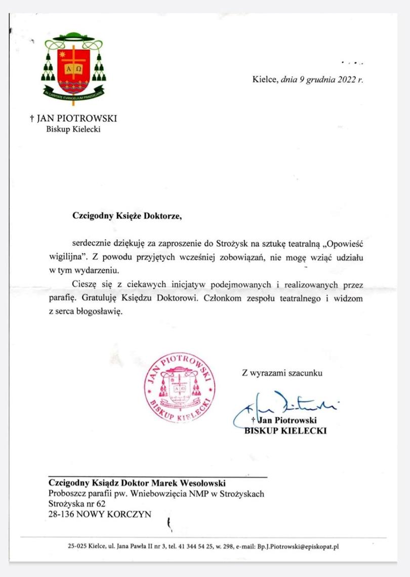 „- Cieszę się z ciekawych inicjatyw podejmowanych i realizowanych przez parafię. Gratuluję Księdzu Doktorowi. Członkom zespołu teatralnego i widzom z serca błogosławię” – napisał m.in. ordynariusz Diecezji Kieleckiej ks. bp. Jan Piotrowski’ w liście  skierowanym do proboszcza parafii Strożyska, ks. Marka Wesołowskiego