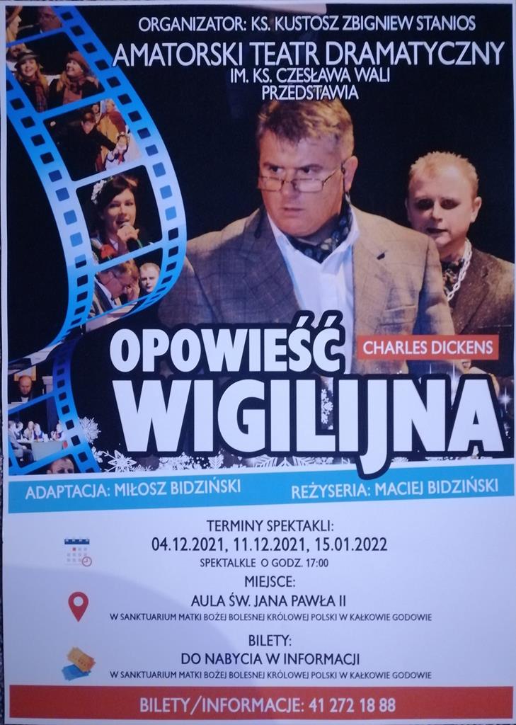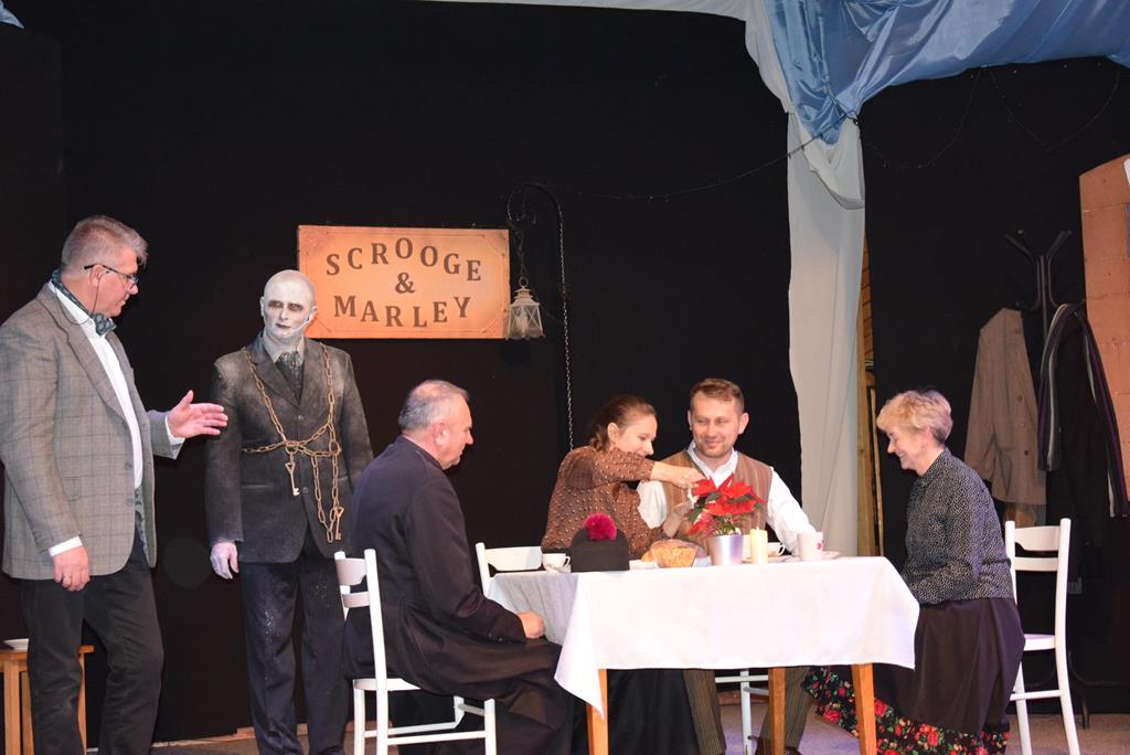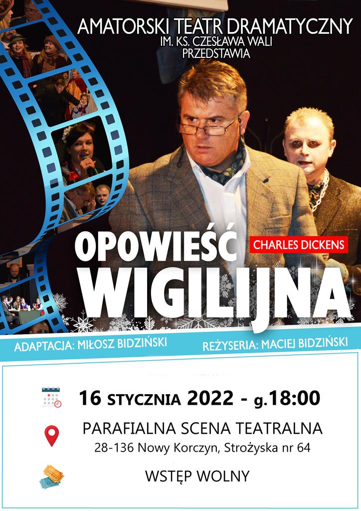 W najbliższą niedzielę, 16 stycznia, na deskach Parafialnej Sceny Teatralnej w Strożyskach ze spektaklem „Opowieść wigilijna” wystąpi gościnnie amatorski Teatr Dramatyczny im. Ks. Infułata Czesława Wali. Jest to inscenizacja słynnego opowiadania Karola Dickensa o zatwardziałym skąpcu Ebenezerze Scrooge`u, którego w noc Bożego Narodzenia nawiedzają duchy przeszłości, teraźniejszości i przyszłości, powodując jego moralną przemianę. Całość historii dopełniają polskie kolędy i pastorałki przebijające lodowatą duszę Scroog`a magiczną i ciepłą aurą wyjątkowych Świąt Bożego Narodzenia. Wstęp wolny. – informuje i zaprasza proboszcz parafii Wniebowzięcia NMP, ks. Marek Wesołowski i tamtejsza wspólnota parafialna.