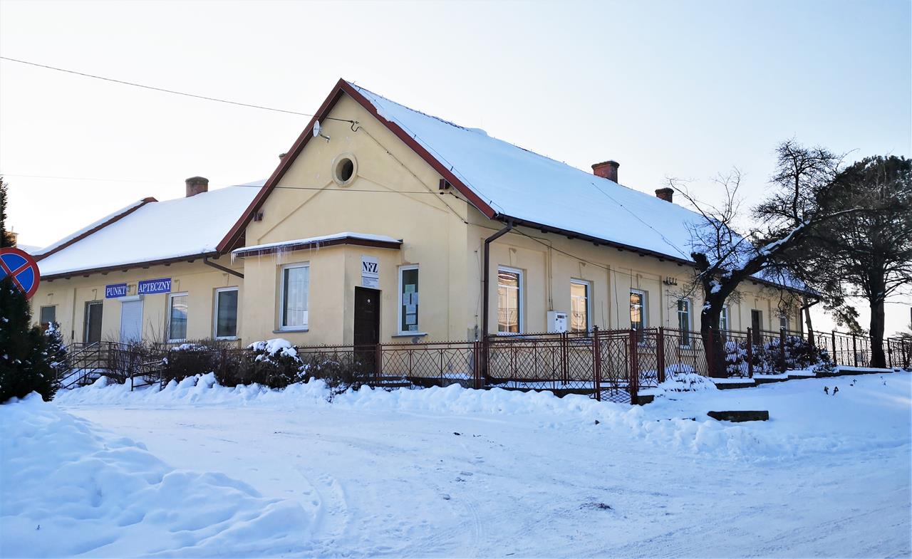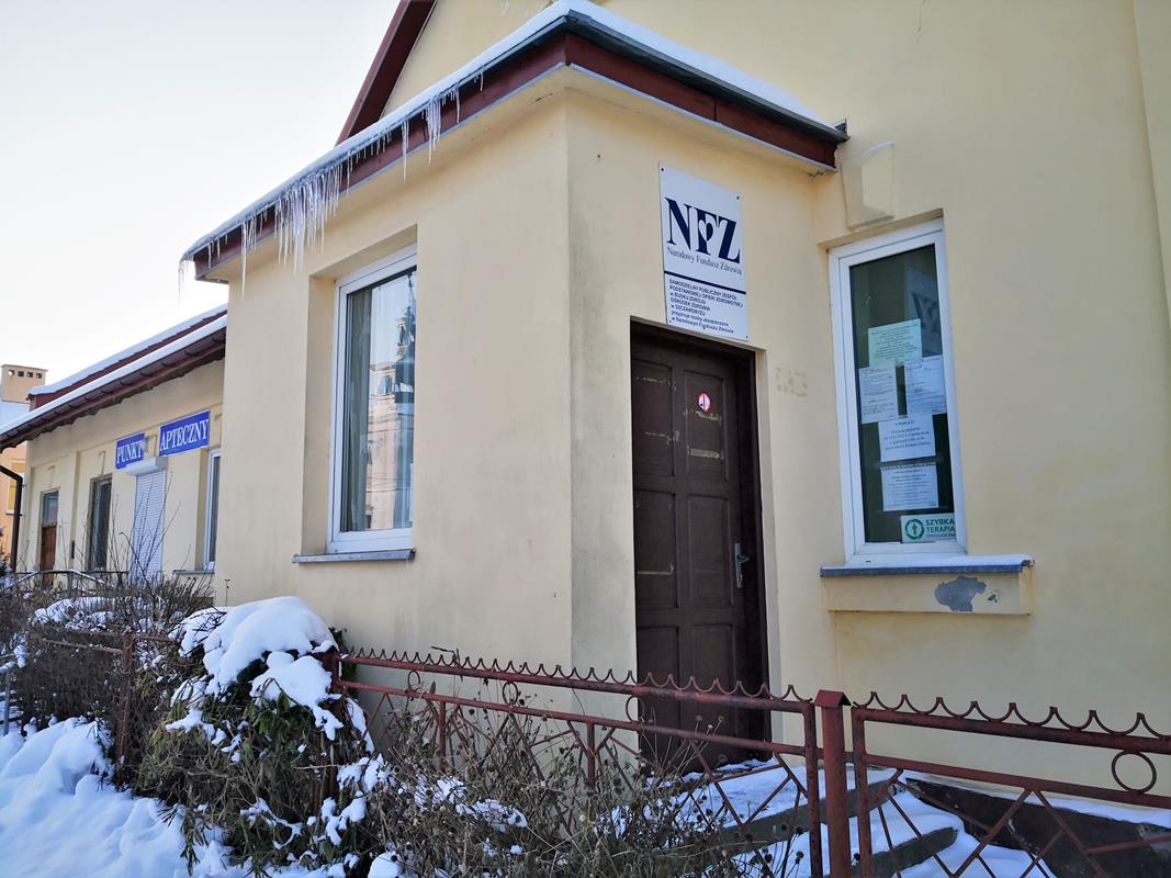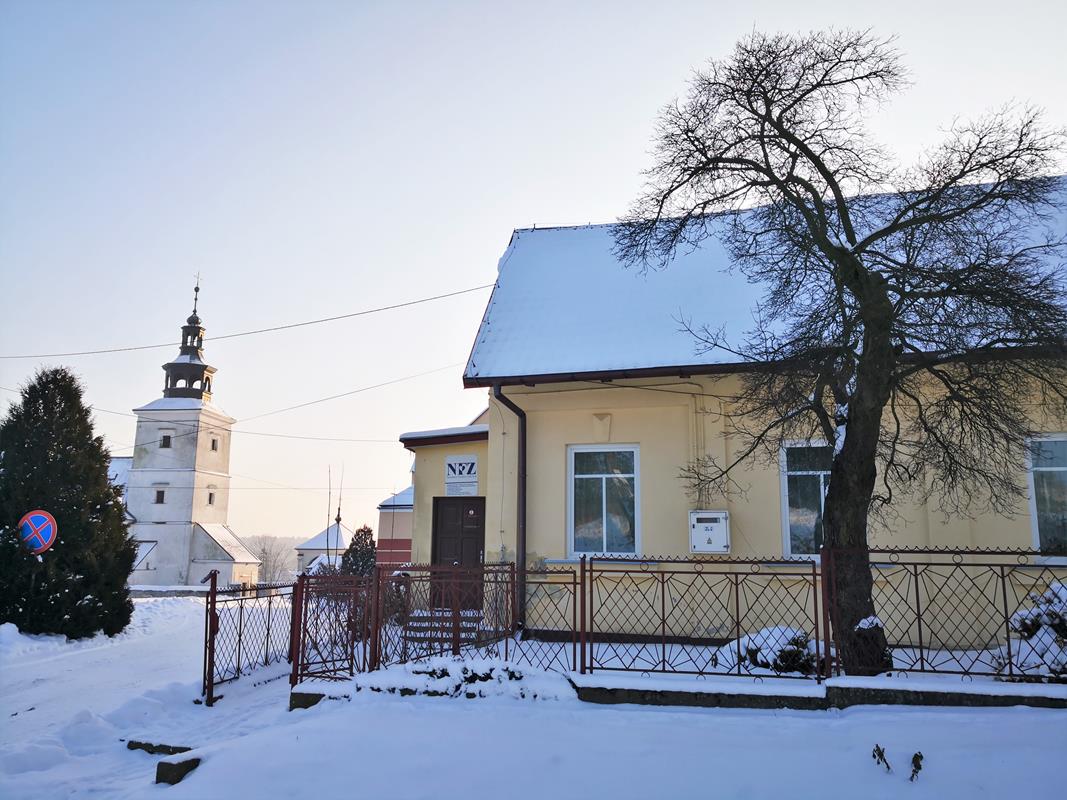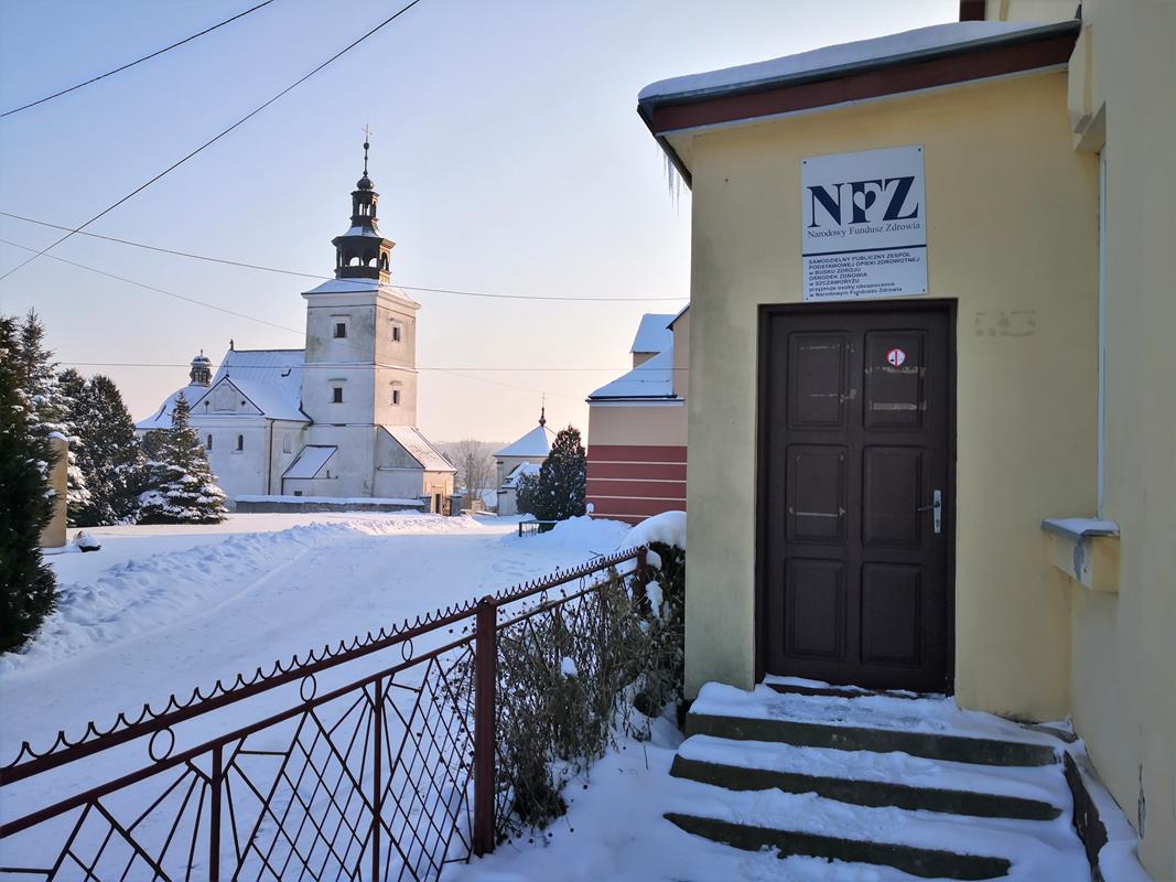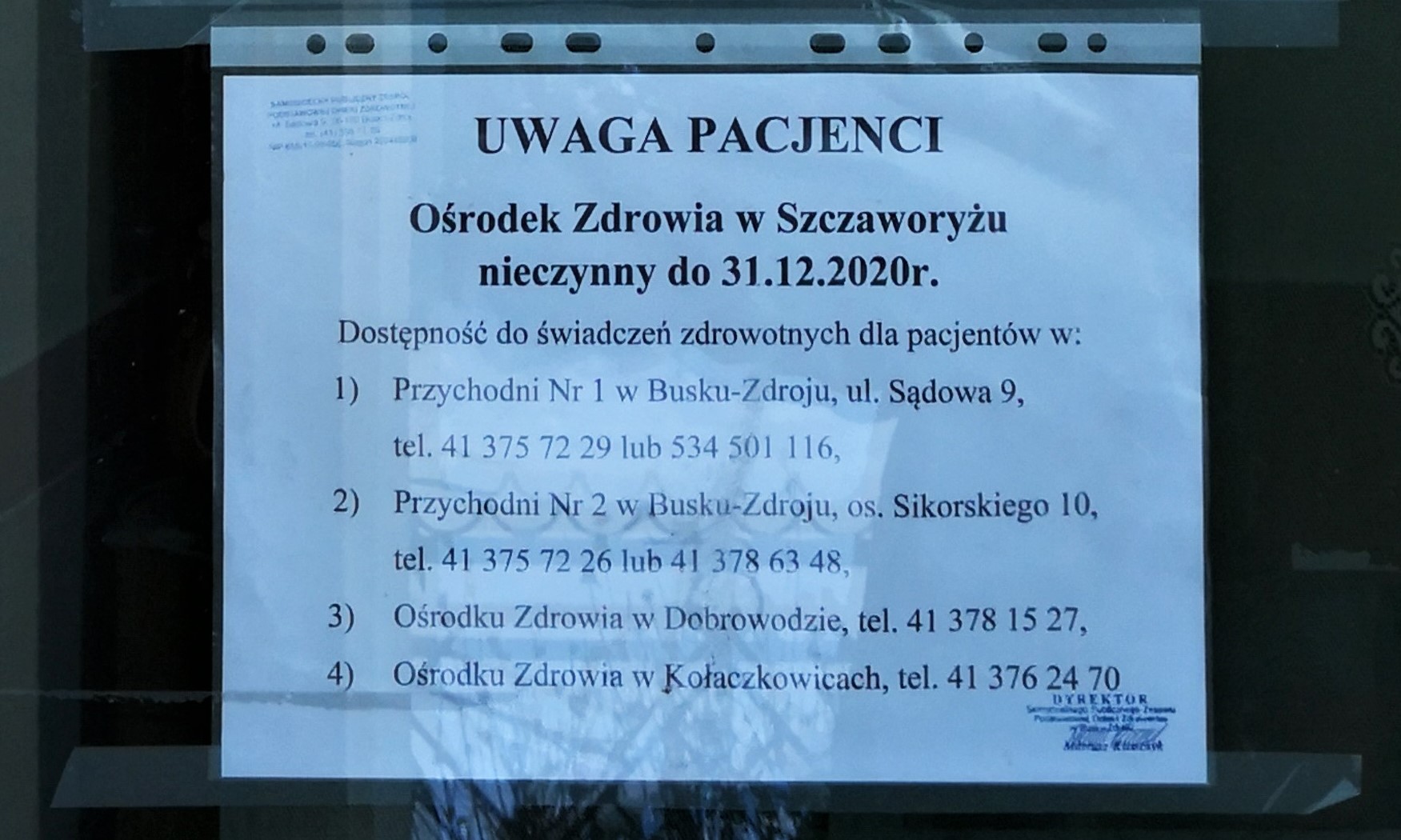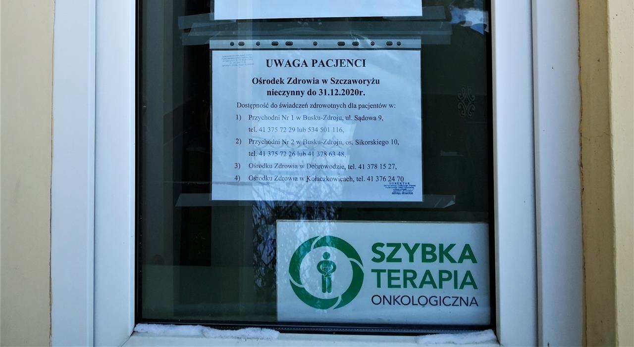○ Szczaworyż, 18.01.2021: Informacja w oknie miejscowego Ośrodka Zdrowia / fot. Jarosław Kruk; infobusko.pl