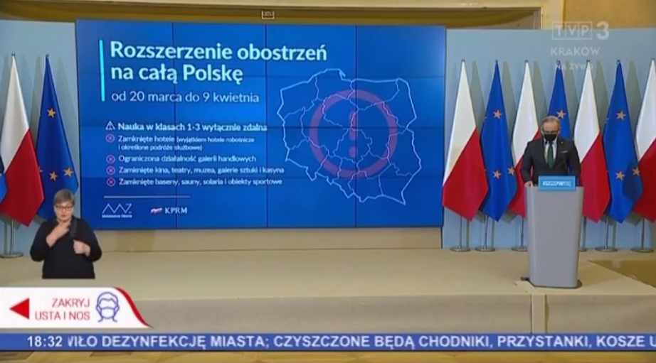Od najbliższej soboty 20 marca do 9 kwietnia w całej Polsce obowiązują rozszerzone zasady bezpieczeństwa. Zamknięte będą hotele, instytucje kultury, obiekty sportowe; ograniczona będzie działalność galerii handlowych; dzieci z najmłodszych klas wrócą do zdalnej nauki. – informuje TVP3 Kraków