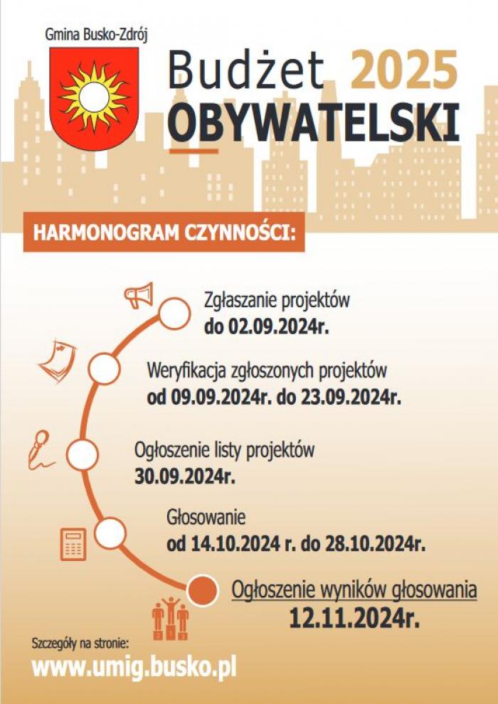 w sprawie określenia harmonogramu czynności oraz wysokości kwoty wydatków Budżetu Obywatelskiego Miasta i Gminy Busko-Zdrój na 2025 rok [ pdf♂ ]