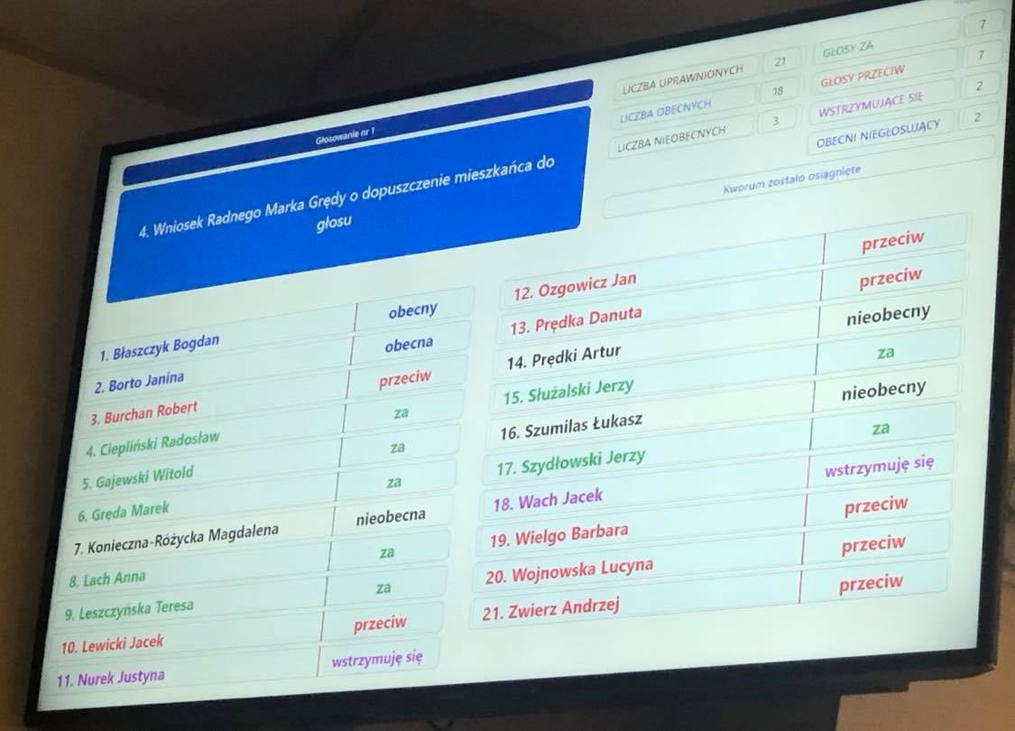 >>> Dziś podczas Sesji Rady Miejskiej wraz z Panią Anną Mazur poprosiłem pisemnie o zabranie głosu wcześniej niż we wolnych wnioskach. Podyktowane to było bardzo ważnymi kwestiami społecznymi, które zostały mi przedstawione przez mieszkańców gminy. Między innymi była to kwestia Przedszkola „Smerfuś”, zalewnia zdroju ściekami i protestu do jakiego zmierzamy w celu unaocznienia nieprawidłowości i łamaniu prawa przez władze gminy. Niestety zaszczuci radni nie mogli zagłosować inaczej. Nazwiska radnych, którzy są przeciw. Oto lista wstydu: Burchan Robert, Lewicki Jacek, Ozgowicz Jan, Prędka Danuta, Wielgo Barbara, Wojnowska Lucyna, Zwierz Andrzej <<< – FB Kamil Oliwkiewicz [16.09.2021]♂
