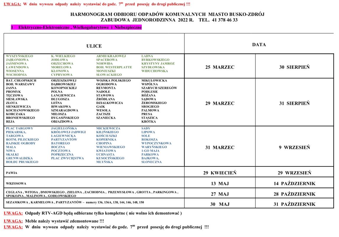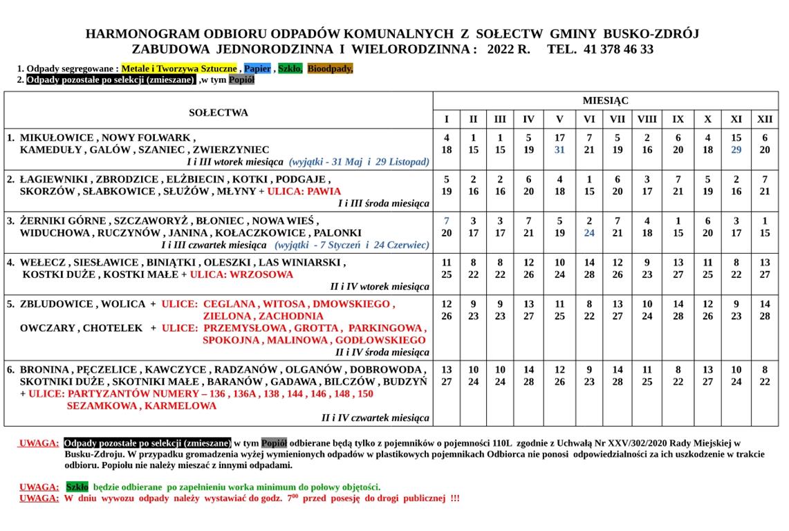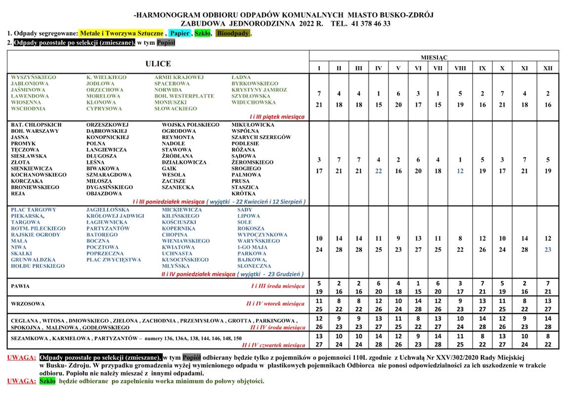 Urząd Miasta i Gminy Busko-Zdrój przedstawia Harmonogram odbioru odpadów komunalnych na 2022r. z terenu Gminy Busko-Zdrój.