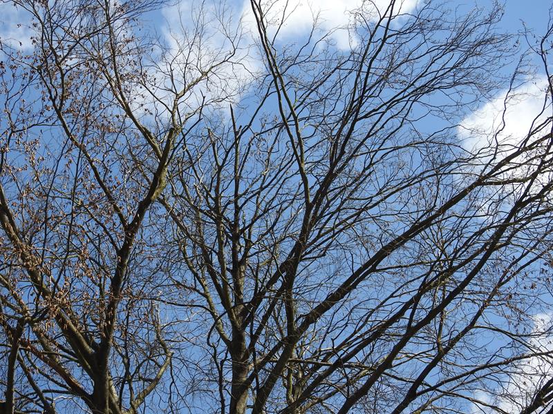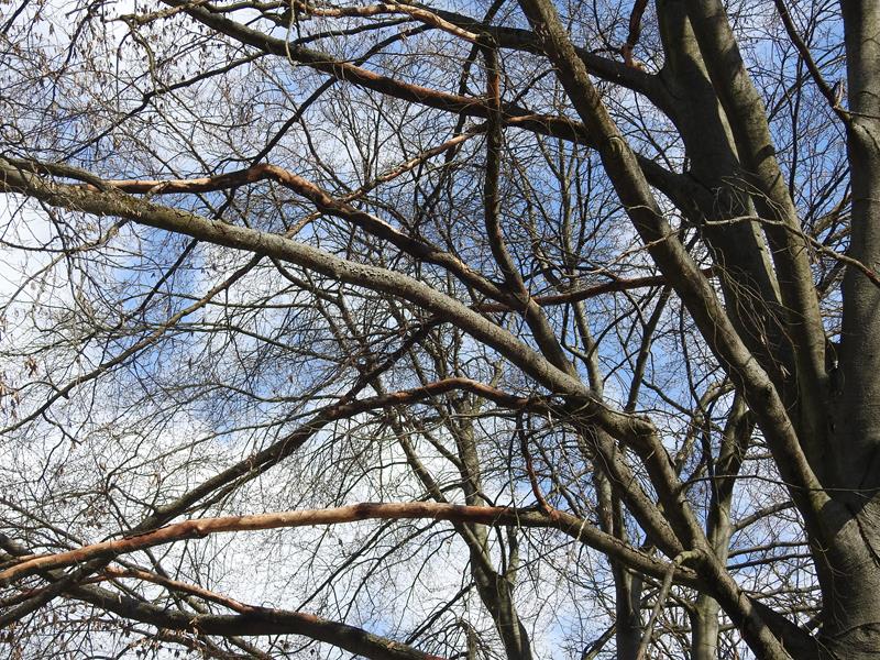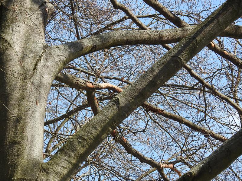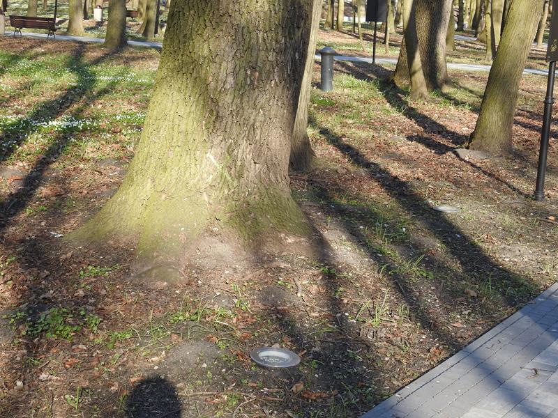 Pod tymi bukami również – podobnie jak pod wspomnianą „świętej pamięci” brzozą i wieloma innymi drzewami – w trakcie rewitalizacji zostały umieszczone barwne reflektory „posadzkowe”. Spotkałem się z opinią, że to właśnie te lampy są przyczyną obumierania wybranych drzew, że to jakoby w trakcie robót instalacyjnych zostały mocno uszkodzone systemy korzeniowe tychże roślin. Może tak być, skoro ten buk czerwony, do rewitalizacji okaz zdrowia i urody, w ciągu ostatnich miesięcy ogromnie zapadł na zdrowiu…