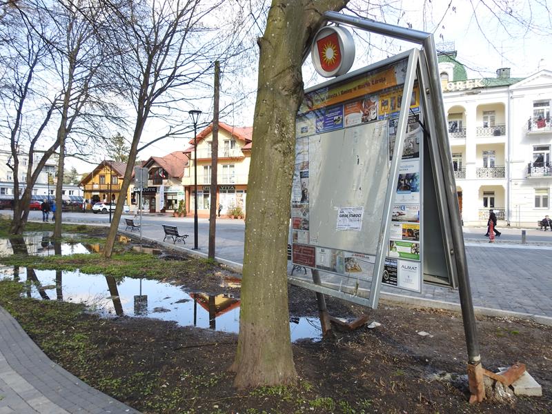 Drugie co, jako osoba regularnie odwiedzająca „zielone płuca” uzdrowiska, dostrzegam przy kolejnych wizytach z narastającym niepokojem to znikające kolejne drzewa (śladem po nich są kolejne łachy świeżych trocin z pił drwali, bo pieńki są w miarę szybko usuwane). Wygląda na to, że „wycinkowe plany rewitalizacyjne” nakreślone w materiałach urzędowych, o czym pisałem w artykule „Rewitalizacja Parku Zdrojowego w Busku-Zdroju – ad vocem 1: 279+283+49=219 ?! Obawiam się, że ktoś wprowadza w błąd opinię publiczną„♂, które zakładały usunięcie bodaj 611 drzew, mimo składanych dementi, są realizowane konsekwentnie. Ba, nawet są przekraczane – wczoraj dostrzegłem, że po dorodnej brzozie, rosnącej przez co najmniej kilkadziesiąt lat pomiędzy fontanną a kawiarnią „Grota”, pozostał tylko dużych rozmiarów pień i sąsiadujące z nim dwa reflektory, które zainstalowano w trakcie rewitalizacji, by podświetlały jej koronę…