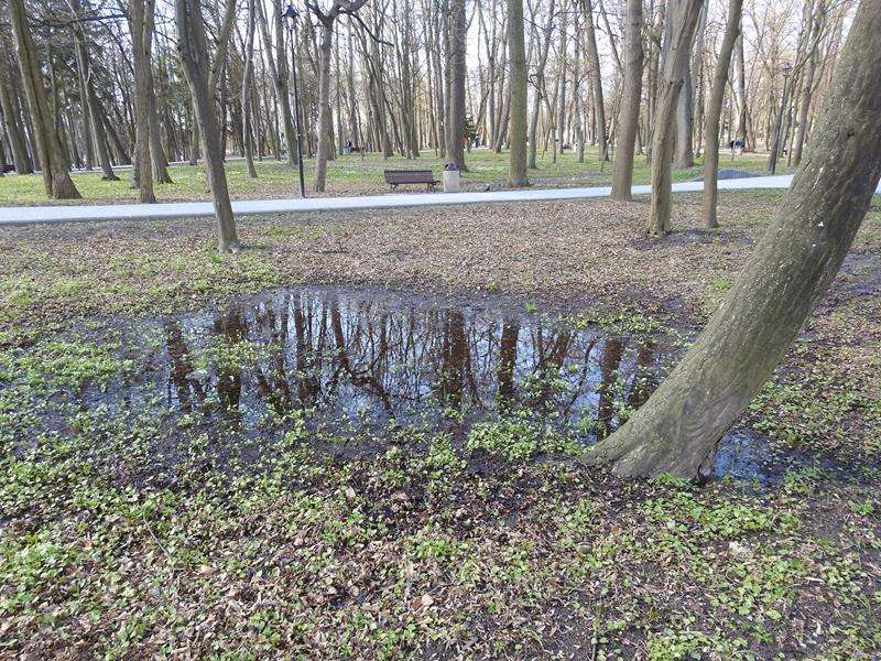 Trzecim, dla mnie bardzo niepokojącym zjawiskiem, są utrzymujące się od dłuższego czasu bajorka wody i grzęzawiska, które utworzyły się w okolicy zatoki drogowej na 1 Maja, vis-a-vis sanatorium Oblęgorek, opodal kaplicy św. Anny. Nie pamiętam by kiedykolwiek wcześniej stała tam woda. Obawiam się, że ta woda i nadmiar wilgoci mogą źle zadziałać na rosnące na tym obszarze drzewa… Wiadomo, że Zdrój dawniej był terenem podmokłym. Sądzę więc, że w 1836 r. , przy okazji zakładania parku, wykonana została jakaś melioracja, pewnie z użyciem drewnianych rur, bo wtedy tak się to robiło. Oceniam, że ta instalacja odwadniająca skutecznie działała niemal dwa wieki, do czasu gdy w park przy okazji rewitalizacji wjechały kilkutonowe i kilkudziesięciotonowe pojazdy. I wygląda mi na to, że takiego traktowania „drenaż Marconiego” po prostu nie wytrzymał. Woda więc nie odchodzi, tworzą się oczka i grzęzawiska. Tak ja to oceniam. Warto by przyjrzeli się temu specjaliści.