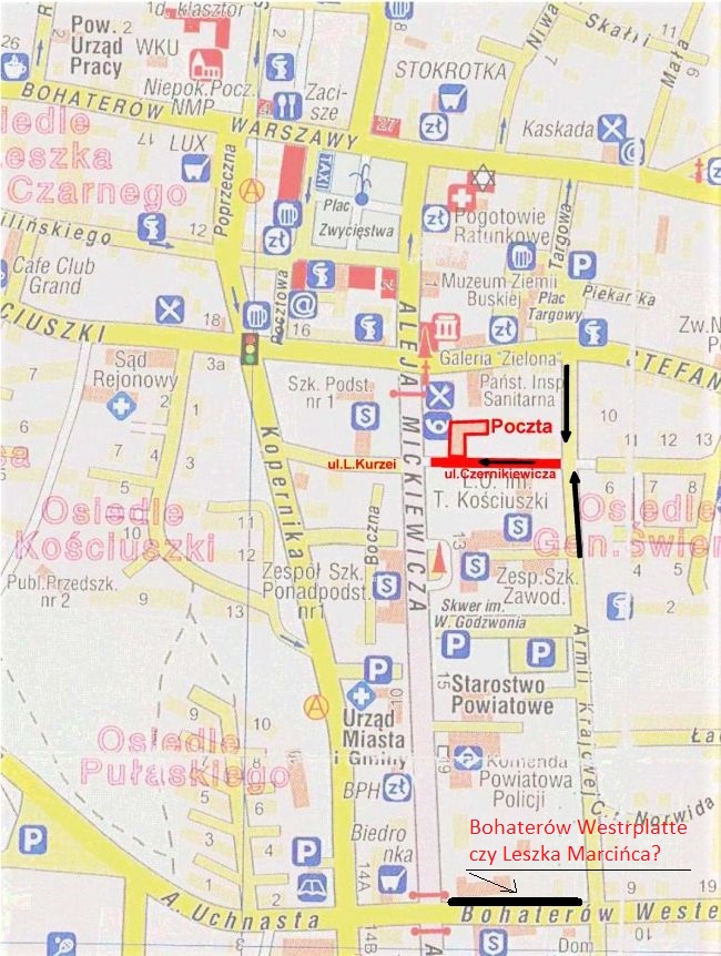 Trzecia sprawa – UMiG powinien posługiwać się chyba aktualnymi mapami. Według mojej wiedzy ulica Bohaterów Westerplatte na odcinku od Al. Mickiewicza do ul. Armii Krajowej nosi obecnie imię Leszka Marcińca – stosowne zaznaczenie naniosłem na mapce powyżej.