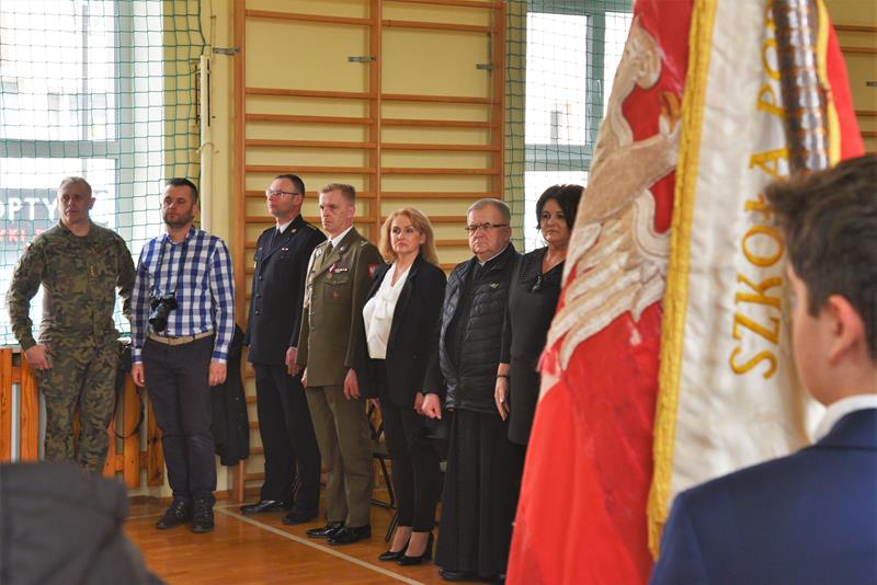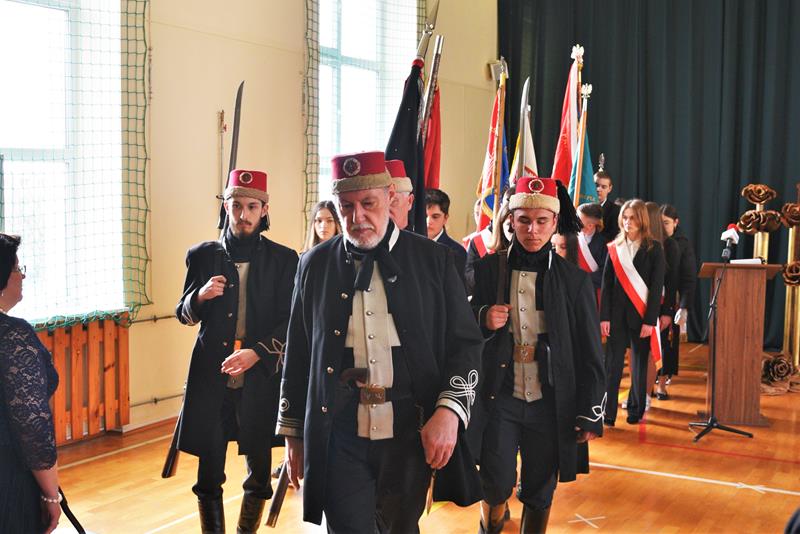 Następnie głos zabrała Pani Irena Sobieraj, starszy wizytator Kuratorium Oświaty w Kielcach także podkreśliła znaczenie tego wydarzenia oraz wskazała na istotne wartości odgrywające dużą rolę w kształceniu przyszłych pokoleń Polaków: patriotyzm, odpowiedzialność za losy ojczyzny, mądrość i szlachetność czynów. Przywołała również słynne słowa Stanisława Staszica, patrona szkoły: ,,Takie będą Rzeczypospolite, jakie młodzieży chowanie”.