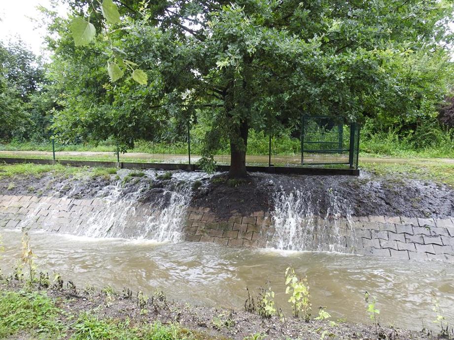 ○ 2021.08.06 godz. ok~10.50, Siesławice 194, Oczyszczalnia Ścieków Miejskiego Przedsiębiorstwa Gospodarki Komunalnej w Busku-Zdroju♂: masy wód opadowych spływające do cieku Maskalis, który uchodzi do Nidy.