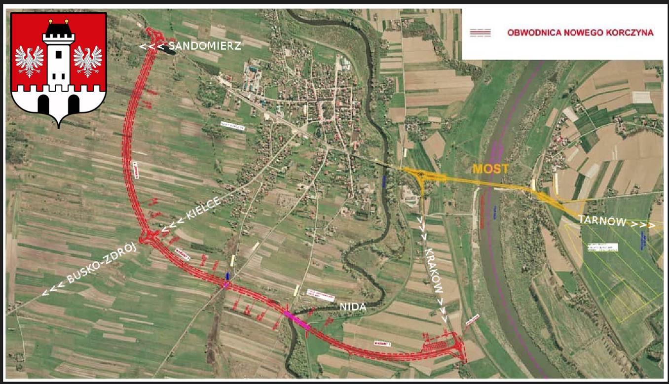 ○ Zadaniem wykonawcy będzie budowa nowego odcinka drogi wojewódzkiej o długości blisko 3,5 km. Trzeba również wybudować nowy most na rzece Nidzie o długości 207 m, a także wiadukt nad drogą powiatową o długości ponad 23 m./ źródło: Radio Kielce♂ | Herb Nowego Korczyna / Wikimedia Commmons♂