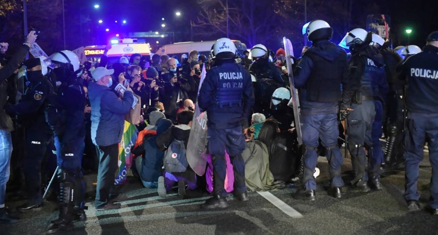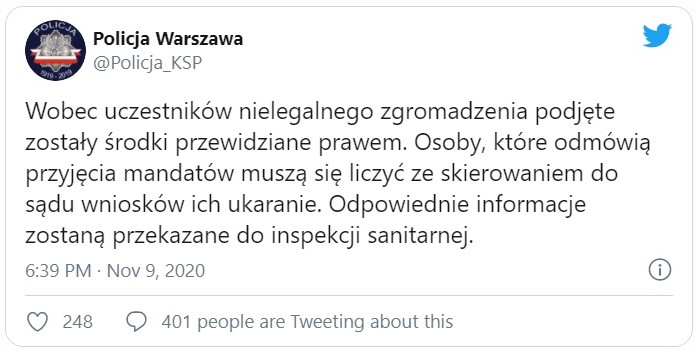 „Policjanci interweniują w Alei Szucha, gdzie grupa uczestników nielegalnego zgromadzenia zablokowała jezdnię. Osoby te lekceważyły wezwania do zachowania zgodnego z prawem. Użyto siły fizycznej, przeniesiono osoby na pobocze i chodnik. Przywrócono normalny ruch pojazdów” – napisano na profilu Policji Warszawa na Twitterze.