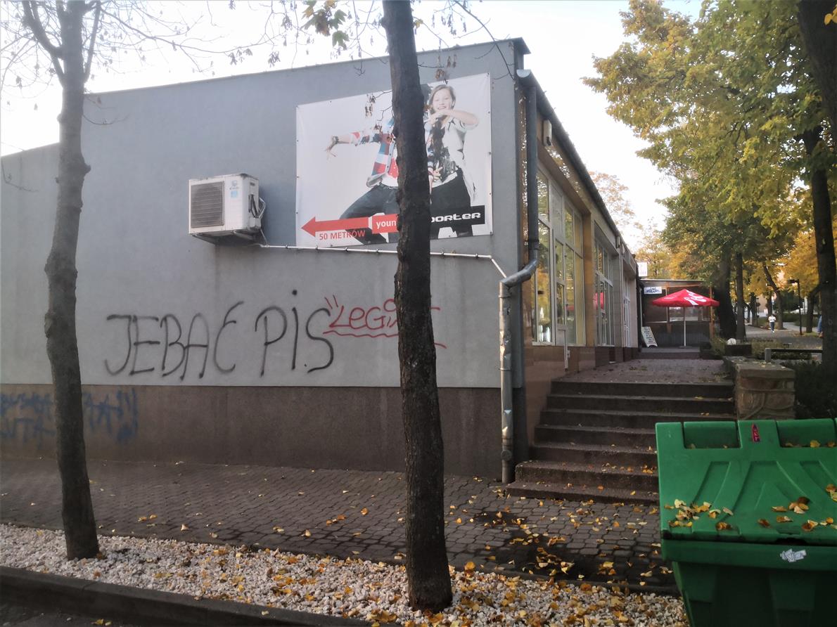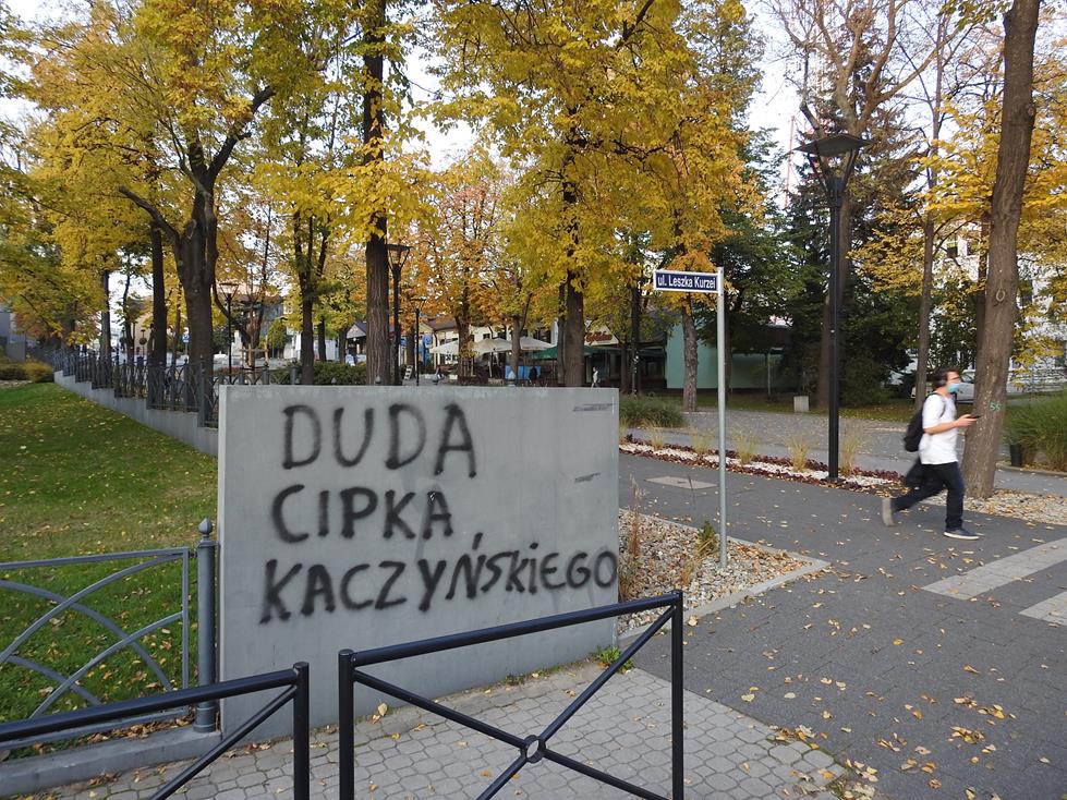 Z nastaniem dnia, we wtorek 27 października, na Alei Mickiewicza i w kilku miejscach w Zdroju słoneczne światło ujrzały  wulgarne napisy o treściach politycznych. Graffiti nawiązuje zapewne do ostatnich wydarzeń w kraju. – informuje Radio Kielce i portal busko.com.pl