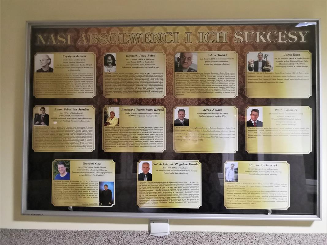 ♦ Wikipedia: – I Liceum Ogólnokształcące im. Tadeusza Kościuszki w Busku-Zdroju♂ –liceum ogólnokształcące mieszczące się w Busku-Zdroju, przy Alei Mickiewicza nr 13. Szkoła została powołana do życia w 1918 r. w Stopnicy staraniem miejscowej ludności i lokalnego Koła Polskiej Macierzy Szkolnej. Na początku było to ośmioklasowe gimnazjum, do którego uczęszczali uczniowie ze Stopnicy oraz okolicznych miast i wiosek. Pierwsze zajęcia w szkole odbyły się 1 września 1918 r. Tego dnia do nauki przystąpiło 80 uczniów. Placówką kierował Władysław Szychulski. W 1920 r. narastające kłopoty finansowe gimnazjum rozwiązał Sejmik Powiatowy w Busku przejmując szkołę i dofinansowując ją z własnych środków. 1 września 1920 roku na dyrektora został powołany historyk Michał Kińczyk, osobisty przyjaciel premiera Wincentego Witosa. W 1923 r. dyrektor Kińczyk doprowadził do przekształcenia szkoły w placówkę koedukacyjną i od 1 września 1923 r. w gimnazjalnych ławkach zasiadły również dziewczęta. W tym samym roku odwiedzający rejon Stopnicy premier rządu Wincenty Witos złożył oficjalną wizytę w placówce. Na początku lat trzydziestych narastający w kraju kryzys ekonomiczny nie ominął również tamtejszego regionu. Malała liczba uczniów, rosły koszty utrzymania placówki – pojawiła się groźba zamknięcia szkoły. By temu zapobiec Sejmik Powiatowy pod przewodnictwem ówczesnego starosty Feliksa Tarnogórskiego 30 stycznia 1933 r. podjął decyzję o przeniesieniu szkoły ze Stopnicy do Buska. Szkołę uruchomiono w gmachu przy ówczesnej al. 3 Maja, dzisiejszej Mickiewicza, w budynku, który Starostwo Powiatowe otrzymało od Józefy Majewskiej z Honowskich. W 1934 r. szkole zostało nadane imię marszałka Józefa Piłsudskiego. W tym samym okresie w Polsce przeprowadzana była reforma szkolnictwa. W jej ramach w buskiej szkole utworzono…♂