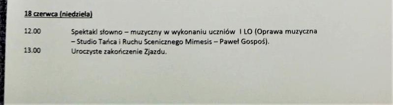 Niedziela, 18 czerwca, była trzecim, ostatnim dniem X Zjazdu Absolwentów I LO. W południe, w hali sportowej Ogólniaka wystawiony został spektakl „Mały Książę”, w reżyserii prof. Pauliny Figiel-Gut, wspólne dzieło uczniów I LO i Studia Tańca i Ruchu Scenicznego „Mimesis”’, przedstawienie oparte na zaliczanej do klasyki światowej literatury powiastce filozoficznej o baśniowej fabule , „Mały Książę”’, pióra Antoine’a de Saint-Exupéry’ego’.