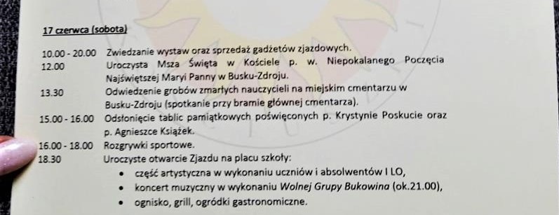 W miniony weekend w Busku-Zdroju odbyła się jubileuszowa X edycja Zjazdu Absolwentów I Liceum Ogólnokształcącego im. T. Kościuszki z okazji 105-lecia szkoły. Uroczystości rozpoczęły się w piątek, 16 czerwca 2023 roku, od symbolicznego poloneza absolwentów „105 par na 105-lecie Liceum”. – informuje 20.06.2023 portal busko.com.pl