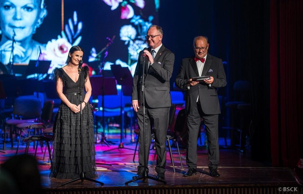 ○ Busko-Zdrój, 5.07.2025: Wspaniała gala finałowa na scenie sali widowiskowej Buskiego Samorządowego Centrum Kultury zakończyła tegoroczne wielkie buskie święto muzyki. Od lewej: Katarzyna Legawiec, Jerzy Szydłowski i Artur Jaroń. / fot. BSCK / źródło: Radio Kielce♂